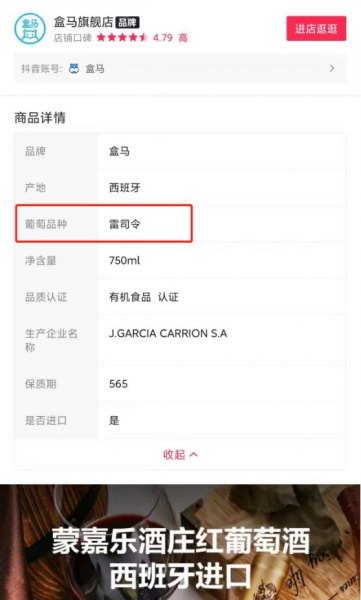 据了解,涉嫌虚假宣传的产品名为“蒙嘉乐酒庄红葡萄酒”,在盒马抖音官方旗舰店的商品标题显示为“盒马/蒙嘉乐酒庄红葡萄酒750ml(半干)”。