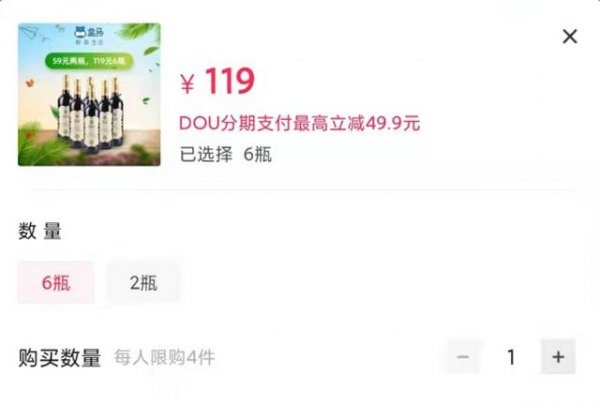 根据上述说法,标注错误信息是否涉及虚假宣传、是否会受到处罚,还需要根据商品交易份额来判定。在抖音的“盒马旗舰店”平台,WBO发现该产品包邮价格为119元6瓶,59元2瓶,已售数量为114,在盒马的官方APP中,该产品已下架。