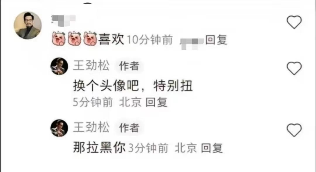 也有网友在王劲松发布的动态下表示自己喜欢,似乎铁了心不想要更换头像。对此,王劲松的回复只有“那拉黑你”四个字,看起来的确十分不近人情。