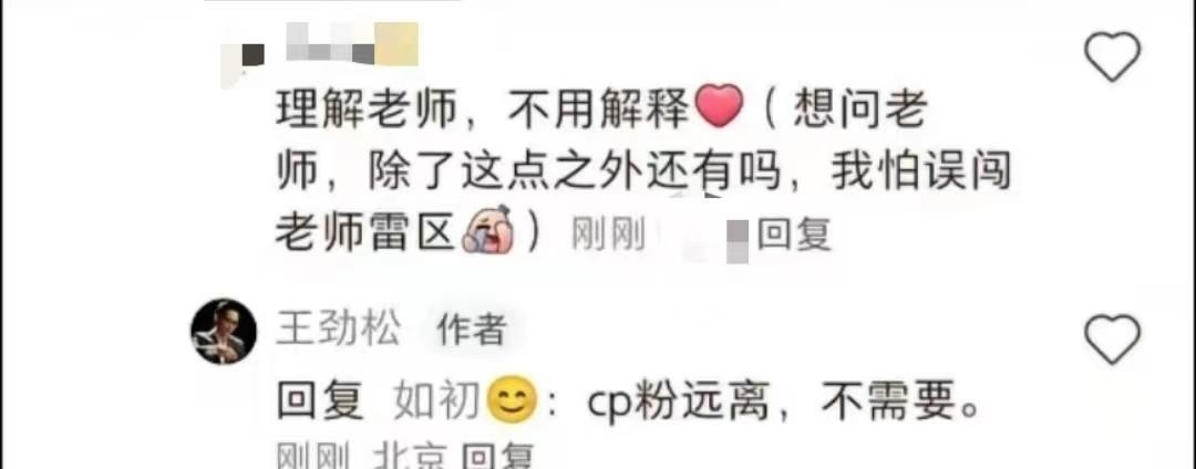 很显然,一部分网友并不懂得这一点。自然就无法理解,当王劲松看到私信和评论区中那些顶着自己照片的粉丝,发布一张张自己与其他男演员的大尺度“CP同·人图”时,他的心情该是怎样的沉重与愤怒?