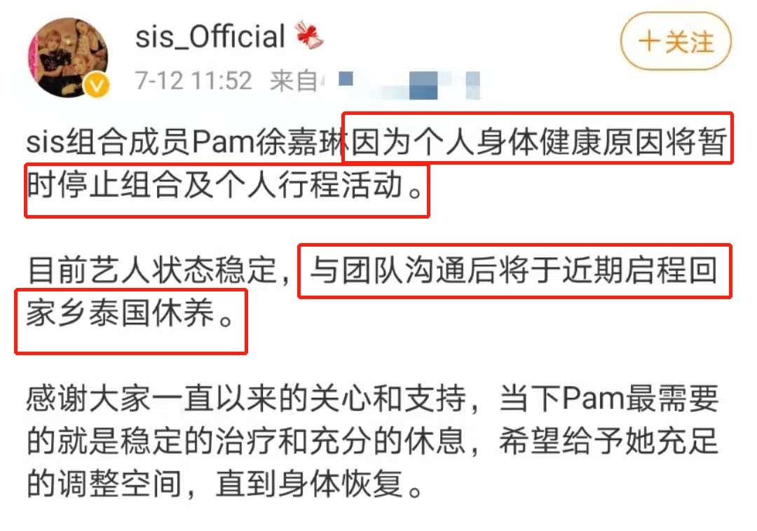 7月12日,一则“女团sis成员Pam疑似抑郁自杀未遂”的帖子受到网友关注。
