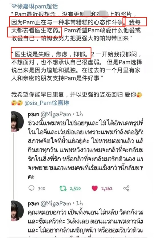 不仅如此,在该条动态发布不久后,徐嘉琳又多次与粉丝分享自己糟糕的状态,并透露自己每天都需要看医生和吃药,医生判断其是焦虑导致的抑郁。