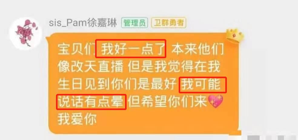 7月11日,正是徐嘉琳24岁的生日,她空降粉丝群,告诉粉丝“自己好一点了,但可能说话有点晕”,似乎是进一步坐实其此前自杀未遂,目前正在恢复期的传闻。