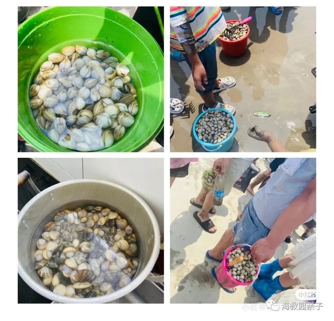 3、赶海工具:小耙子在这里是最好用的,带上水桶,如果家里没有也不用担心,公园附近有很多小摊贩,价格不贵;方便的话可以自备小马扎,遇到一窝的贝壳坐着挖更省力,讲究的可以带上手套,以免划伤手。