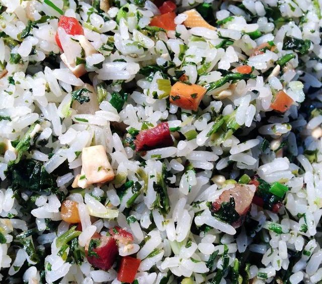 青蒿的绿,野葱的白,豆腐干的黄,腊肉的肉色,社饭的颜色丰富、漂亮,让人看了就有食欲。