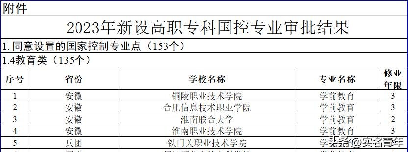 3月14日,教育部公布了2023年高等职业教育专科专业设置备案和审批结果。文件显示全国共有112所高职专科院校获批135个教育类专业。此外,有91所高职专科院校申报的112个教育类专业没有通过备案和审批,有2所学校需要实地评估。审批同意设置的国控专业将导入全国职业院校专业设置管理与公共信息服务平台,自2023年起可以招生。