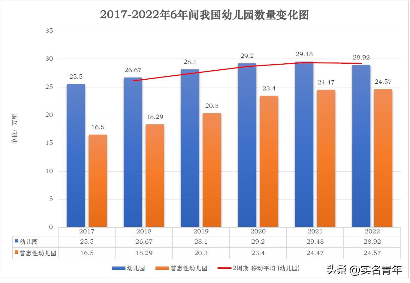 经统计2017-2022年全国教育事业发展数据,全国幼儿园数量从2017年的25.5万所,增长至2022年的28.92万所,但2022年相比2021年,幼儿园数量出现6年来首次下降,减少了5600余所。