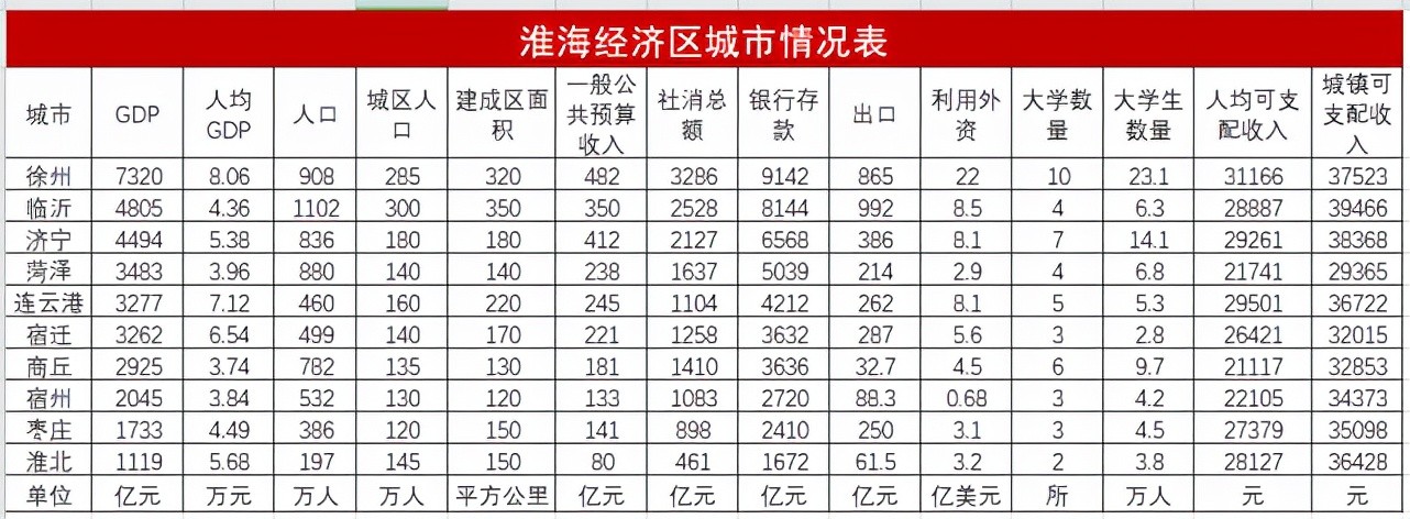 淮海经济区的核心城市徐州,2020年GDP7320亿(江苏第六),人均GDP8.1万,人口904万,城区人口290万,建成区面积320平方公里,地铁通车里程64.1公里,城市高架路里程71公里(全省第7),规模以上工业营收4681亿(全省第9),规模以上工业利润288亿(全省第7),一般公共预算收入482亿(江苏第六)。淮海经济区的龙头老大,在江苏省内只能位居中游,放在大龙云集的长三角更不出众。显然,徐州作为淮海经济区的火车头,分量还太轻,合格的城市群核心GDP应达到1万亿以上,城区人口达到500万以上。