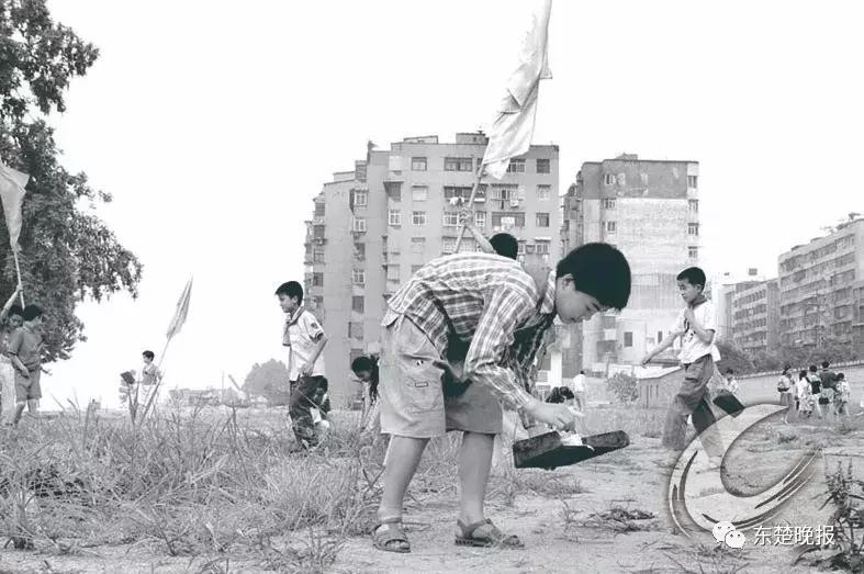 ▲ 2003年,西塞山区中窑江滩公园还是一片废弃地。一群学生在江边拾垃圾,美化环境。