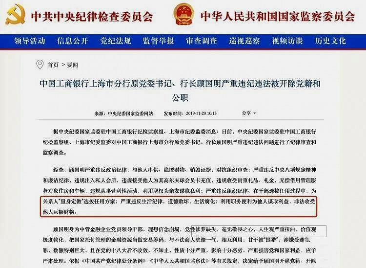 2019年6月6日,上海纪委发布了一则消息:工商银行上海分行党委书记、行长顾国明个人涉嫌严重违纪违法,接受纪律审查和监督调查。