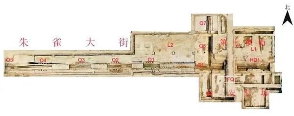 在朱雀大街上发现了东西横穿的水渠。出土有隋五铢、开元通宝、乾元重宝铜钱,还有陶背水罐、弦纹罐、绿釉碗、白瓷碗、白瓷盆、青瓷盏、黑釉唾壶、青釉执壶、莲花纹瓦当等。
