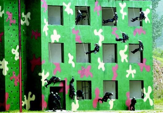 在接下来的“反恐演练”课目中,火力突击、立体清缴、抓捕撤离等环节精彩上演,将现场观众的视线逐渐引向指挥楼上空。2架直升机从观礼台上方呼啸而来,突击摩托车机降滑出、突击队员索降而下……空降特战队员从多个方向、多个角度对“恐怖分子”营地展开围剿,他们顽强的战斗作风、先进的作战手段赢得了现场的阵阵掌声。