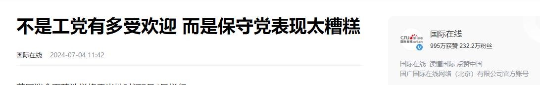 面对这一情形,一位欧洲专家就此称英国工党的胜利并不出乎意料,根据整个选举的过程就可以看出,民众们不是选择了工党,而是彻底地将保守党给抛弃了。