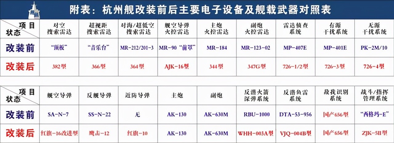 “杭州”舰改装前后主要作战装备对比