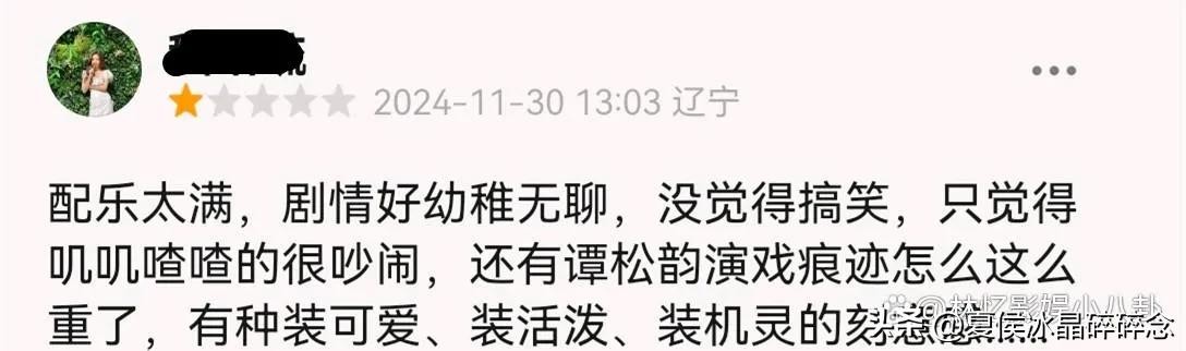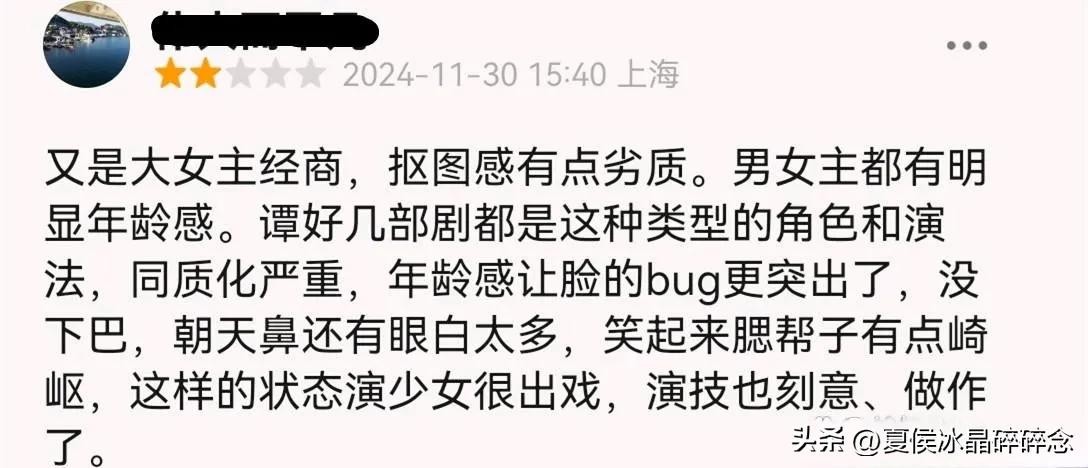 2、谭松韵饰演的女主咋咋呼呼演技浮夸,状态不好脸垮,不适合演可爱型了,还搬出虞书欣来比较。(难道看剧的都是芳龄十八的大姑娘?谭松韵状态还不好啊…可能我太老了)