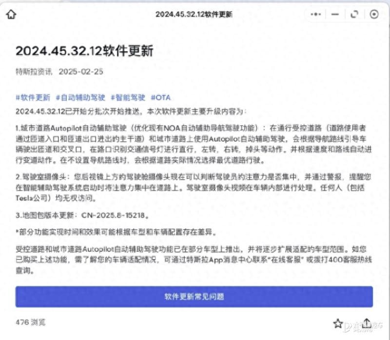 【太平洋汽车 行业频道】北京时间2月25日,特斯拉在官网上发布了2024.45.32.12软件更新,准备向用户分批推送城市道路Autopilot自动辅助驾驶(优化现有NOA自动辅助导航驾驶功能)、驾驶室摄像头、地图包版本更新三项功能,不过该公告发布没多久后就被撤下,引发大量关注与讨论。