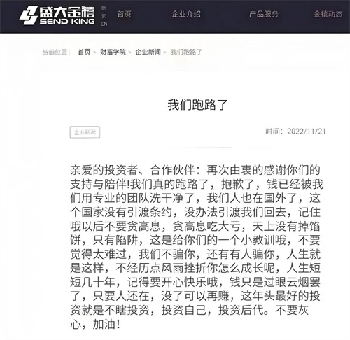 长沙盛大金禧成立于2011年,凭借夸张的收益迅速席卷全国,涉案资金194亿。其嚣张之处在于崩盘跑路后,还堂而皇之在其官网上发布《我们跑路了》公告,声称“钱已经被我们用专业的团队洗干净了,我们人也在国外了”。