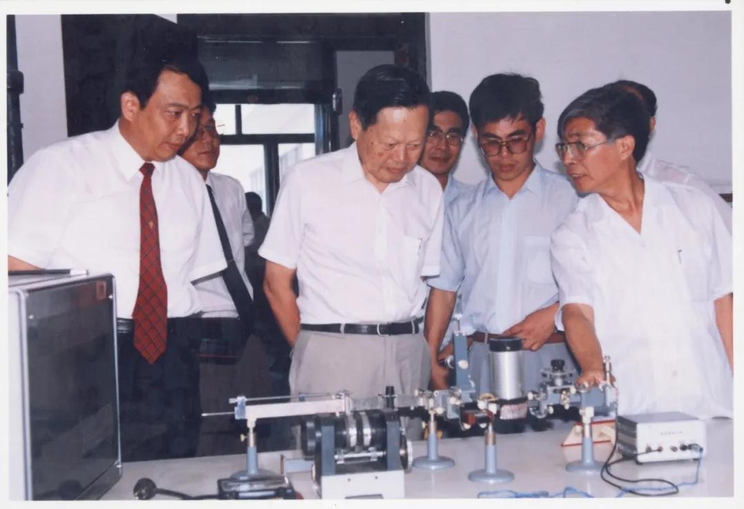 右:诺贝尔奖获得者杨振宁教授(左二)访问物理学院,右二为物理班84届毕业生现中国科学院院士孙昌璞