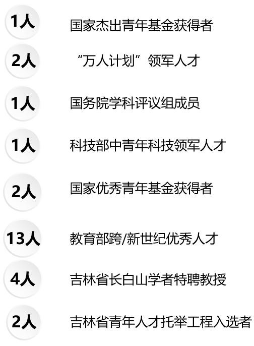 学院师资力雄厚,现有博士生导师38人,教授33人,副教授34人;其中国家杰出青年科学基金获得者 1人,国家百千万人才工程入选者1人,中科院百人计划学者 1人,国家优秀青年科学基金获得者2人,教育部跨/新世纪优秀人才10人,教育部优秀青年教师资助计划入选者3人,吉林省长白山学者特聘教授 6人,全国模范教师1人,第六届教育部科学技术委员会委员及数理学部委员1人,首届教育部高等学校中学教师培养教指委主任委员1人。