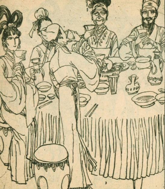 厅堂里摆着丰盛的酒席,老翁老妪坐在中间,八仙、水仙、凤仙,各自陪着自己的丈夫,围坐在桌边,觥筹交错,畅饮无已。侍女们站立四周,仆妇们轮流上菜。
