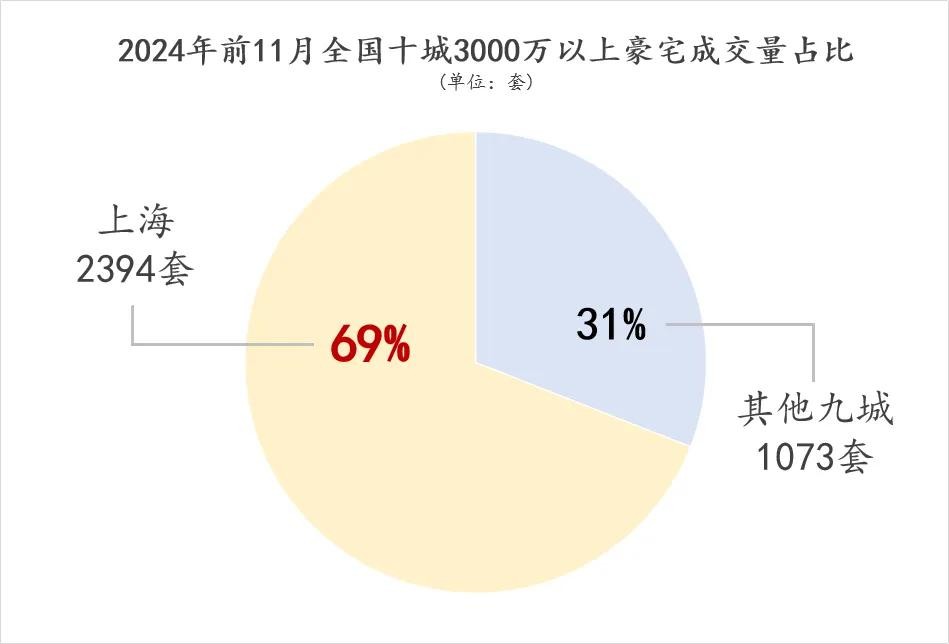 先说结论也就是第二个数字,2024年全国3000万以上豪宅成交,上海占了69%