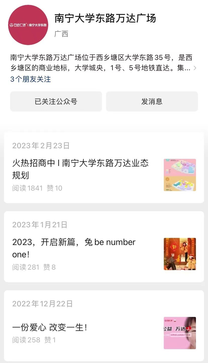 12月16日,“南宁大学东路万达广场”公众号上线,招商宣传循序渐进。