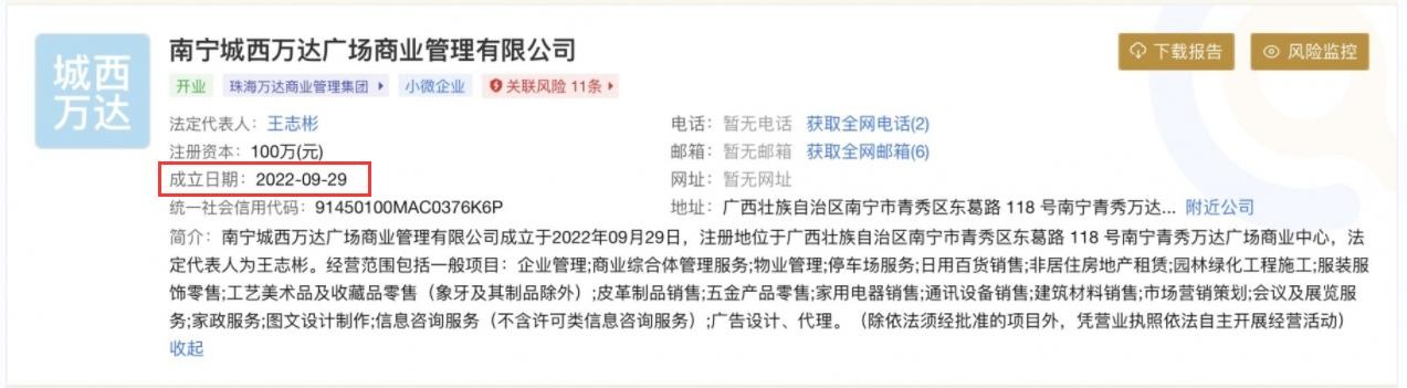 2022年9月29日,珠海万达商业管理集团股份有限公司成立南宁城西万达广场商业管理有限公司,投资比例为100%。