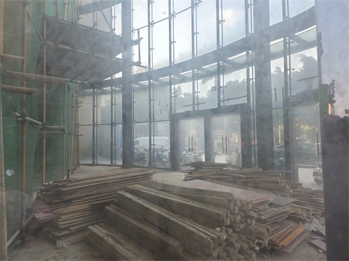 不过,透过大门的玻璃可以看到,大厅内还架着绿网,地上放置着很多木材,但当天没有施工动静。