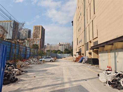 商场另一侧的公区也没有工人在施工,地面上堆放着沙子、管道、红砖等施工材料,还有不少建筑废材。
