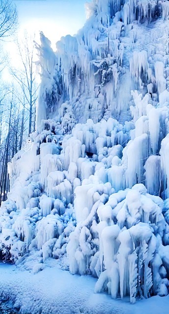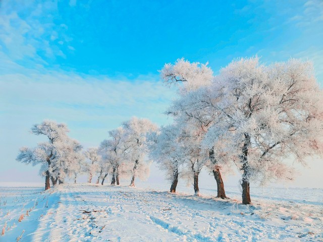 吉林雾凇岛: 冬季时形成的雾凇景观,树木上挂满冰晶,如梦如幻。