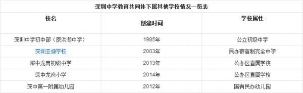 深圳中学创办于1947年,1998年原洪湖中学并入深圳中学,校园成为其初中部。深圳中学的高中部分为东校区和西校区。深圳中学高中部、初中部与其他一些附属学校,包括深圳亚迪学校、深中龙岗初级中学、深中龙岗小学、深中第一附属幼儿园共同组”深圳中学教育共同体“。