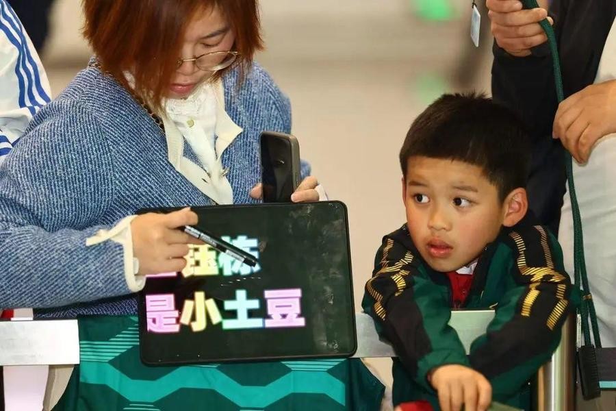 当时,孩子妈妈专门带去了平板电脑,在上面写了“王钰栋,我是小土豆”的滚动字幕。小土豆殷切盼望国足抵达的神情,和一旁平板电脑上的这句话相映成趣,被不少媒体抓拍到,让小土豆一时成了“小网红”。