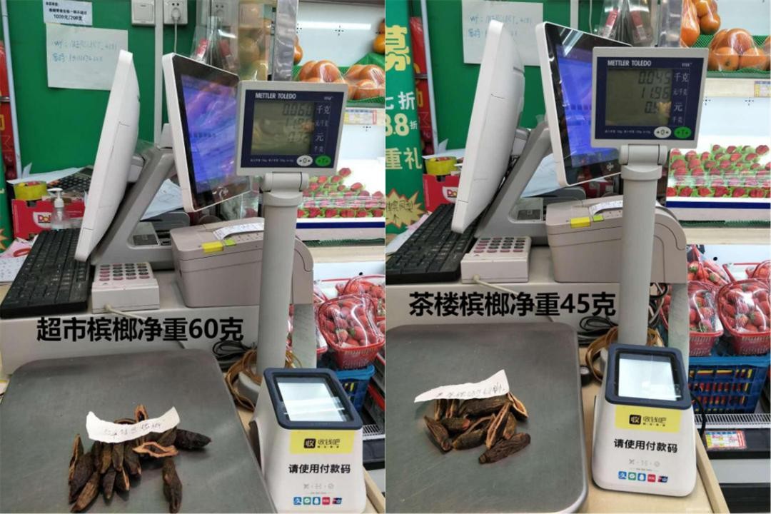 称重:超市槟榔净重60克,大大高于外包装标注的40克净含量;茶楼槟榔45克,略高于外包装标注的净含量。相对产品外包装标注的净含量,茶楼槟榔并未短斤少两,但份量少于超市槟榔。