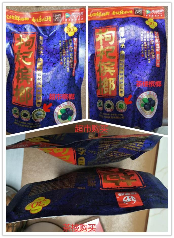 3月8日,记者分别在超市与茶楼购买了一包30元装枸杞槟榔,进行对比。