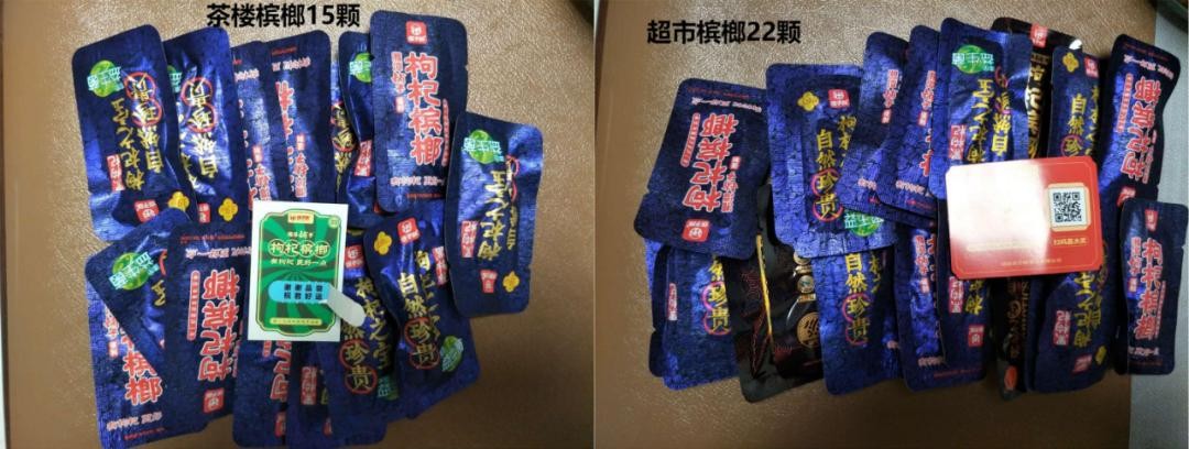 数量:超市槟榔22颗,茶楼槟榔15颗。次日记者在另一家茶楼购买的30元装枸杞槟榔同样无奖,数量17颗。