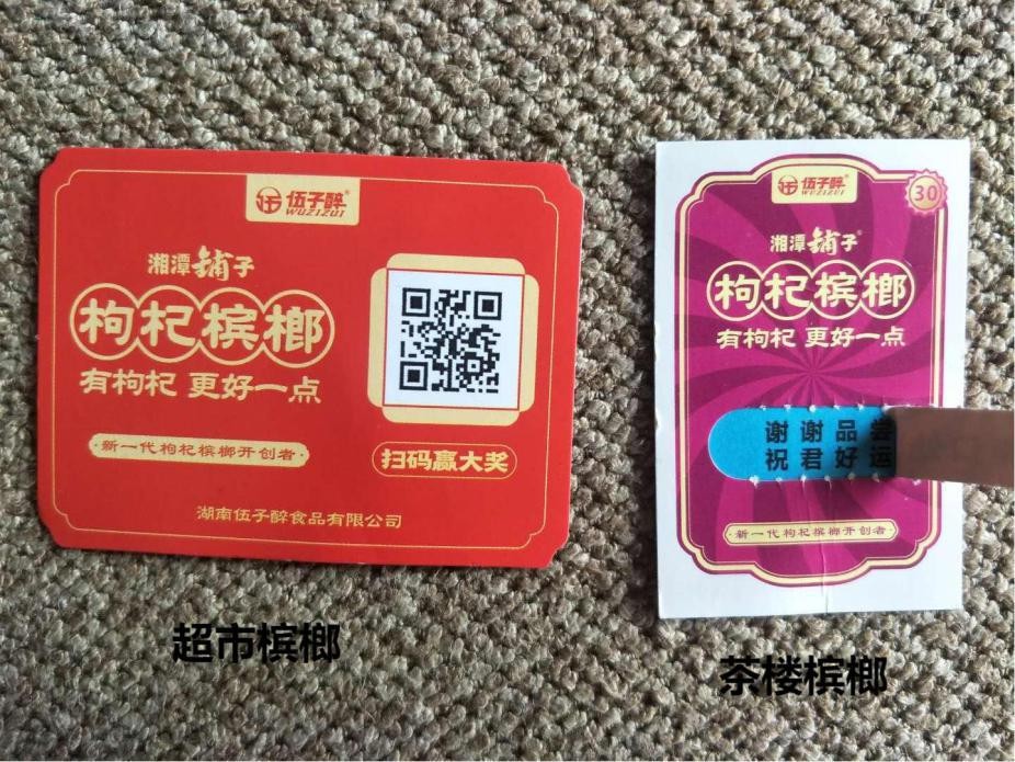 湖南伍子醉食品有限公司生产的湘潭铺子·枸杞槟榔(以下简称枸杞槟榔)进入岳阳市场后,以口味加有奖销售赢得了本地槟榔消费者的青睐,该品牌槟榔有奖销售设置的较高中奖率,更使消费者乐于购买。如20元装的枸杞槟榔,奖设三等,一等奖加6元兑换35元的枸杞槟榔一包,二等奖加5元可兑换价值25元的商品,三等奖加4元可兑换20元枸杞槟榔一包,总中奖率达39%;30元装的枸杞槟榔更是开袋有奖,或中5.18元,或中8.88元。