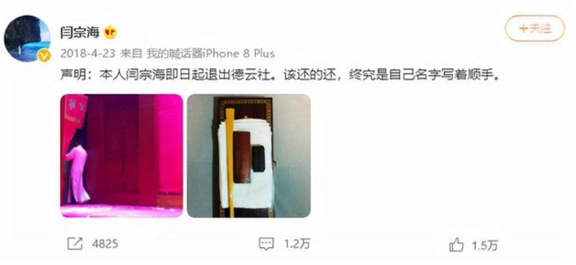 他就主动宣布退出特云社,并归还了郭德纲给他取的名字,从此做回闫宗海。