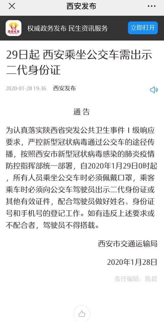 据西安市交通运输局消息,按照西安市新型冠状病毒感染的肺炎疫情防控指挥部统一部署,自2020年1月29日0时起,所有人员乘坐公交车时必须佩戴口罩,乘客乘车时必须向公交车驾驶员出示二代身份证或其他有效证件,配合驾驶员做好姓名、身份证号和手机号的登记工作。如有违反上述要求或不配合者,驾驶员不得搭载。