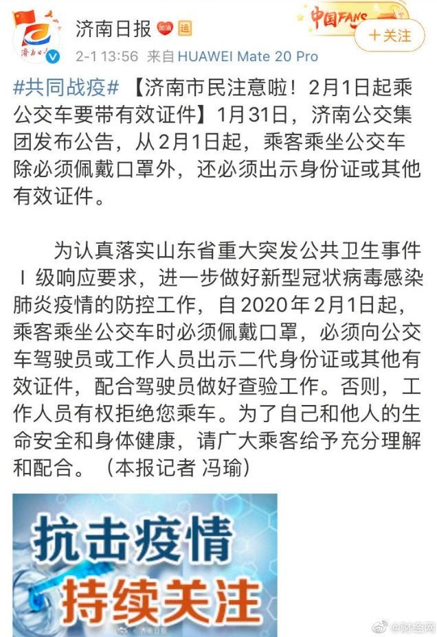 1月31日,济南公交集团发布公告,从2月1日起,乘客乘坐公交车除必须佩戴口罩外,还必须向公交车驾驶员或工作人员出示二代身份证或其他有效证件,配合驾驶员做好查验工作。否则,工作人员有权拒绝您的搭乘。
