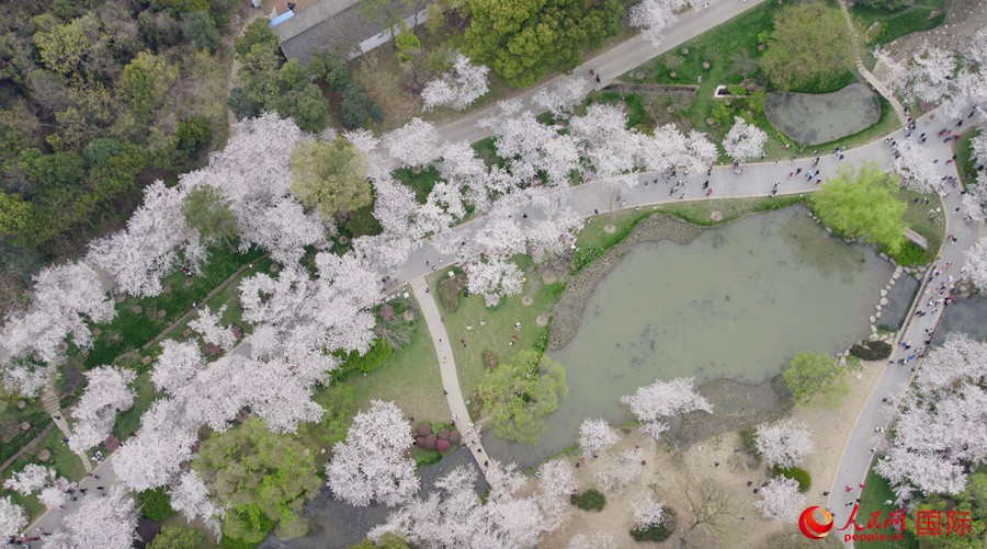 鼋头渚景区内植有3万多株、百余个品种的樱花树,目前正值樱花盛开时节。园区内花开烂漫、如云似雪,风过处落英缤纷、美不胜收,前来赏樱的游客络绎不绝。