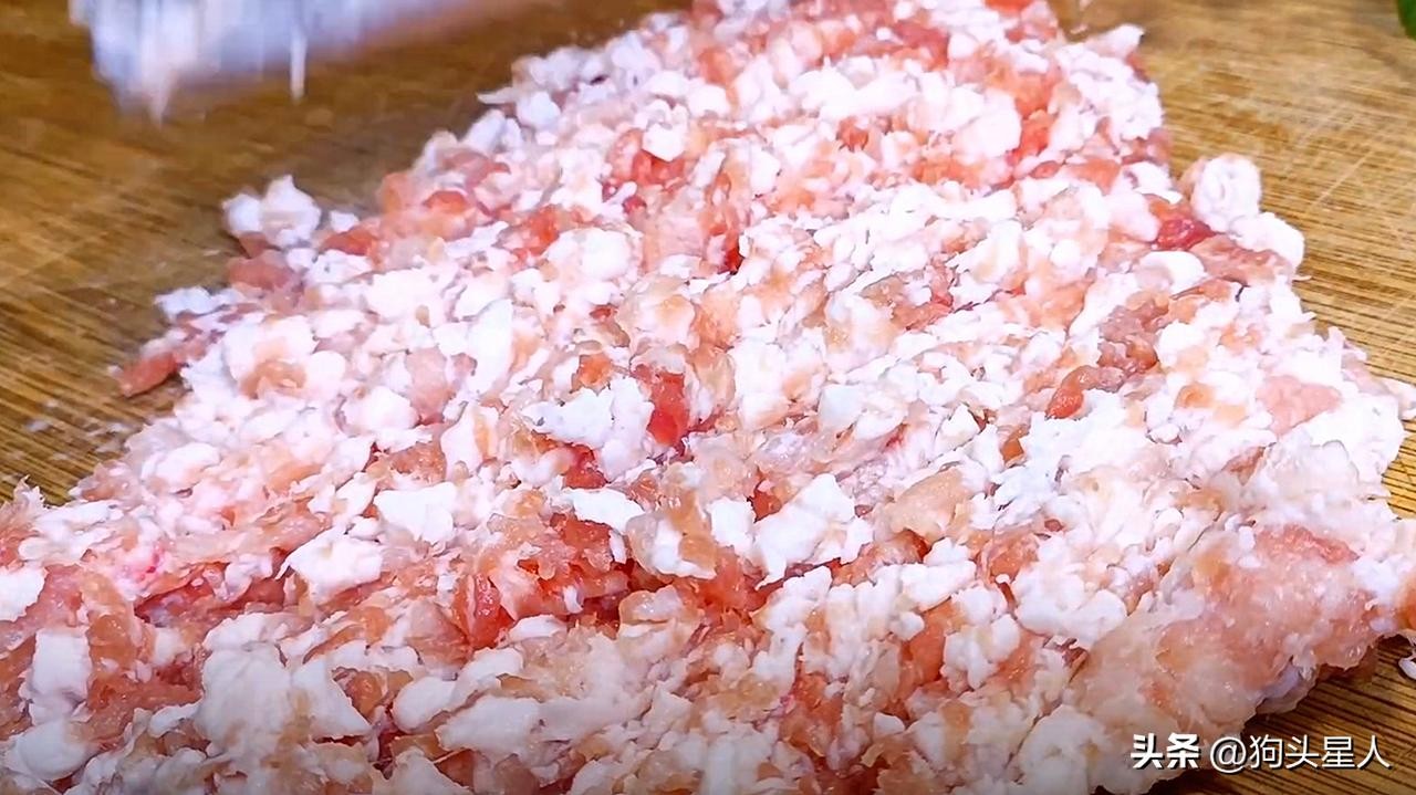 1.准备一块五花肉,把它剁成肉末备用。猪肉肥瘦相间的最好。