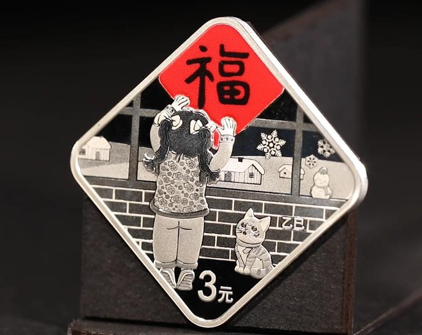 8克菱形贺岁银币的背面图案是小女孩贴福字的场景。新年的招牌动作结合质朴的绘画风格,表达出对新年的期待,看起来温暖又治愈。