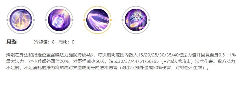 回蓝耗蓝:嫦娥的二技能每次攻击会吸收敌方固定点的法力值和回复自身0.5%—1%的蓝量。
